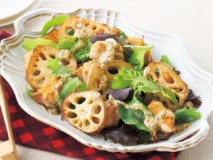 2 〇レンコンは皮つきのまま厚さ1cmの輪切りにする。 |